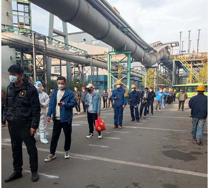 “核酸檢測(cè)人員,自覺(jué)保持2米距離、戴好口罩”10月12日上午,在公司綜合樓門(mén)前,行政處、分廠安全員、核算員積極協(xié)調(diào)核酸檢測(cè)現(xiàn)場(chǎng)秩序,在配合醫(yī)護(hù)人員開(kāi)展檢測(cè)工作的同時(shí),做好防疫宣傳工作。前來(lái)進(jìn)行核酸檢測(cè)的職工在現(xiàn)場(chǎng)排起長(zhǎng)龍,積極配合工作人員的指揮。